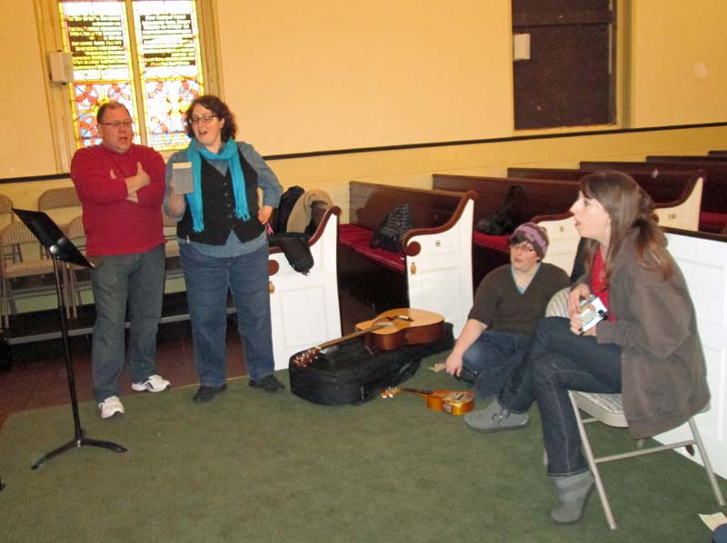 Don Seaman, Elizabeth Cole Sheehan, Lindsey Seaman, and Willow Jayne Anderson rehearse “Hallelujah.”