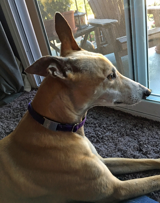 They also make something called a “jingle free tag.” It’s a metal tag that slips directly onto a strap collar and doesn’t make a sound. That’s what I use on what is known by greyhound people as a “tag collar.” Because greyhounds need a special collar or harness for walking, most of us use a second simple collar simple to hold identifying information. (Their necks are bigger than their heads, so a normal dog collar doesn’t work, and greyhounds wear what is known as a martingale collar, or a limited slip collar.) This tag collar remains on at all times. You can order the jingle free tag and several styles of tag collar at 2Houndsdesign.com.